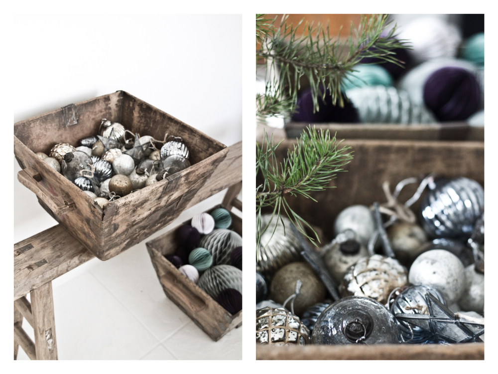 Piękny miks bombek w stylu vintage ale też papierowych, które układamy w wazonach na tacach czy miskach.